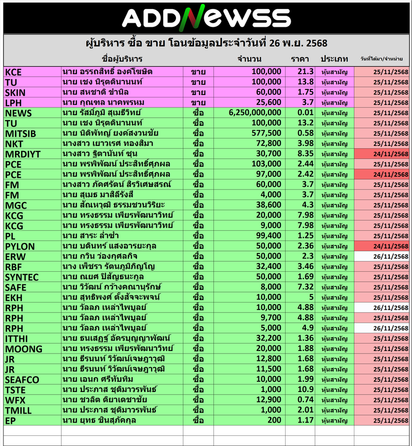 🔥🔥สรุปผู้บริหาร ซื้อ ขาย โอน 📅 วันรายงาน 26/11/2025