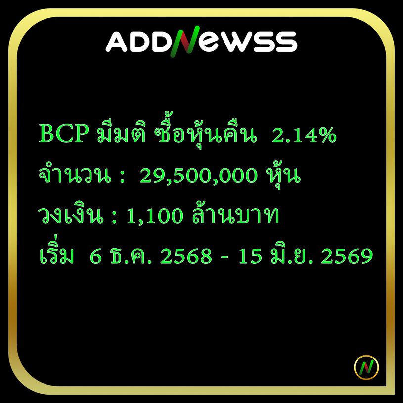 BCP มีมติ ซื้อหุ้นคืน 2.14% จำนวน : 29,500,000 หุ้น วงเงิน : 1,100 ล้านบาท