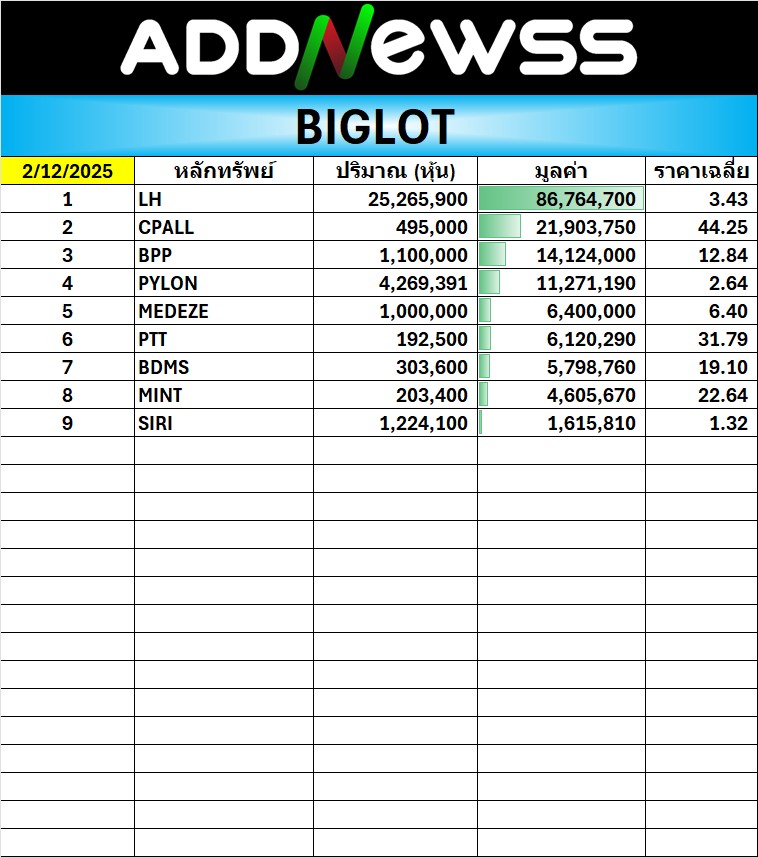 🔥BigLot 📅 02/12/2025 LH มีมูลค่าสูงสุด 86.8 ล้าน ที่ราคาเฉลี่ย 3.43 บ.
