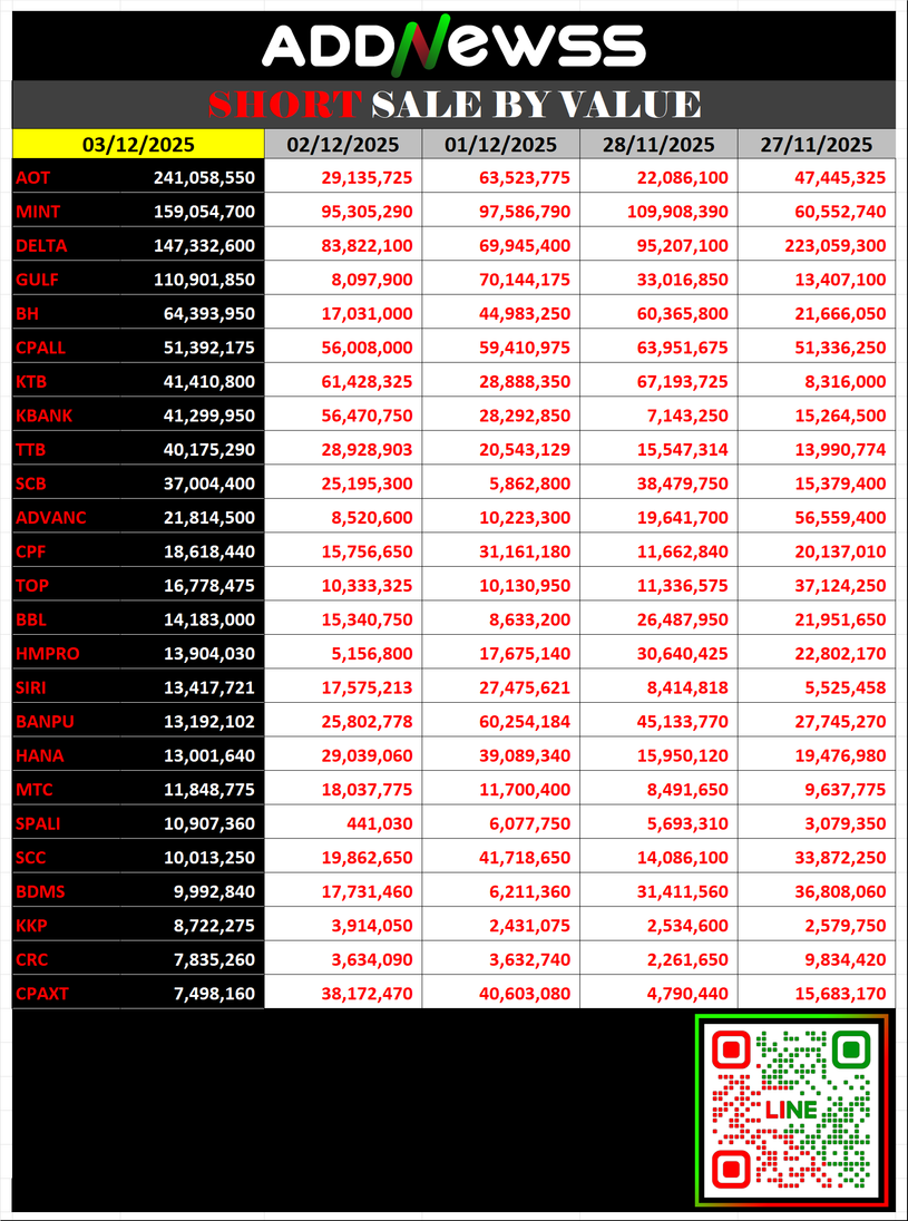 🔴🔴Short Sale 📅 03/12/2025 📅 2025-12-04 08:41 ✎ administrator 🗇 🔴Short 👍 - แชร์โพสต์นี้ 🔴🔴Short Sale 📅 03/12/2025 🟢30 อันดับ Cover Short 🔴30 อันดับ Short เพิ่ม “👀” ดู Short Sale ย้อนหลังได้ที่ https://addnewss.news/post?catid=002