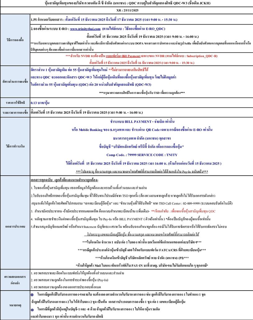 รายละเอียดการใช้สิทธิจองซื้อหุ้นสามัญเพิ่มทุน บริษัท ควอนตัม ดี ซี จำกัด (มหาชน) : QDC ควบคู่ใบสำคัญแสดงสิทธิ QDC-W3 (ชื่อเดิม JCKH)