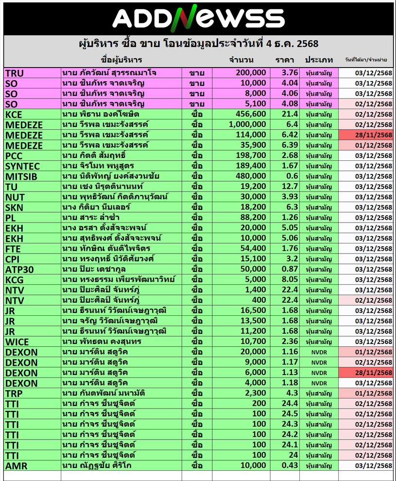 🔥🔥สรุปผู้บริหาร ซื้อ ขาย โอน 📅 วันรายงาน 04/12/2025
