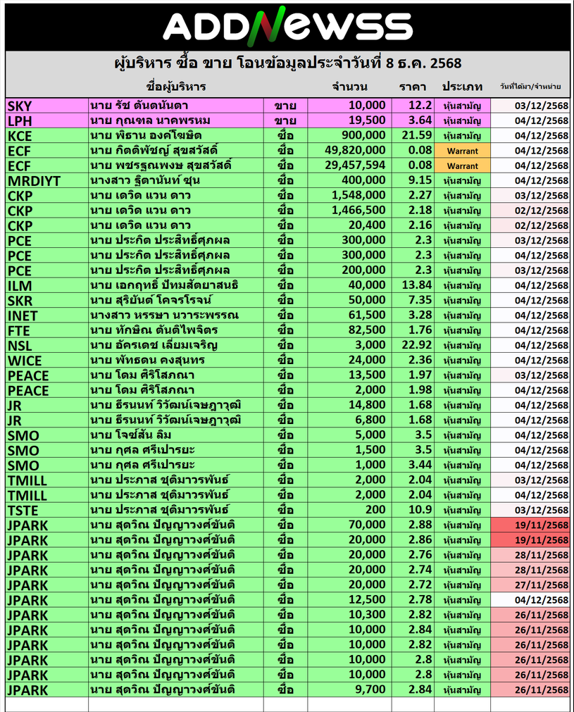 🔥🔥สรุปผู้บริหาร ซื้อ ขาย โอน 📅 วันรายงาน 08/12/2025