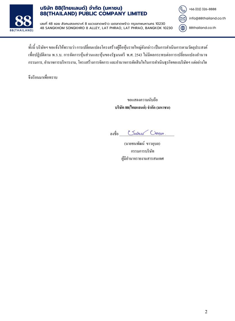 88TH แจ้งการเปลี่ยนแปลงโครงสร้างการถือหุ้นของบริษัท 📅 2025-12-18 19:10 ✎ administrator 🗇 📰News 👍 - แชร์โพสต์นี้ 88TH แจ้งการเปลี่ยนแปลงโครงสร้างการถือหุ้นของบริษัท 2031NWS181220251900232940T.pdf