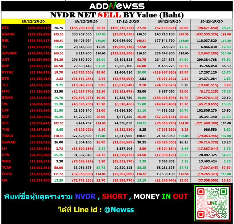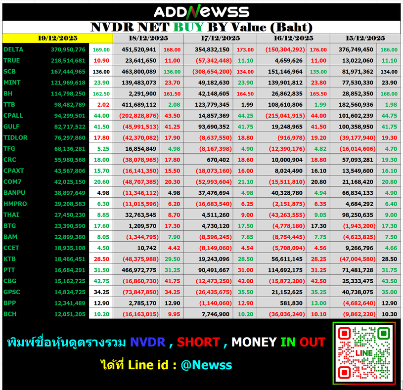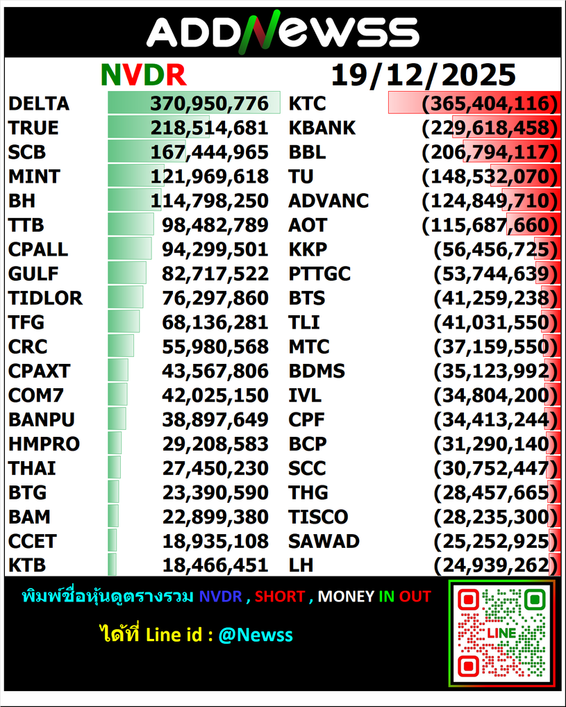 🟢🔴NVDR 📅 19/12/2025 📅 2025-12-20 10:10 ✎ administrator 🗇 NVDR 👍 - แชร์โพสต์นี้ 🟢🔴NVDR 📅 19/12/2025 “👀” ดู NVDR ย้อนหลังได้ที่ 👇👇 https://addnewss.news/post?catid=003 ✨📊 พิมพ์ชื่อหุ้น เพื่อดูตารางรวม 💸 Money 🟢In / 🔴Out 📈 NVDR 📉 Short Sale 👉ดูได้ที่ Line id : @Newss 🔗 https://line.me/R/ti/p/@newss