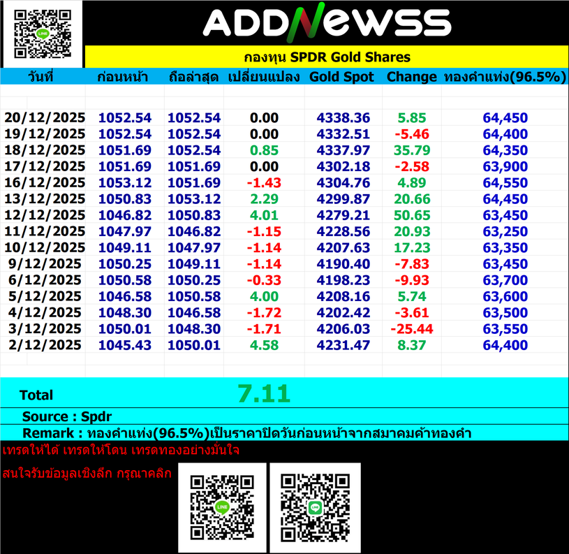 ยอดสะสม Spdr ประจำวันที่ 20 ธันวาคม 2025 📅 2025-12-20 10:22 ✎ bom999 🗇 Gold 👍 - แชร์โพสต์นี้ ยอดสะสม Spdr ย้อนหลังประจำเดือนพฤศจิกายน 2025 https://addnewss.news/post/692a49e6475a669f8e0499a4