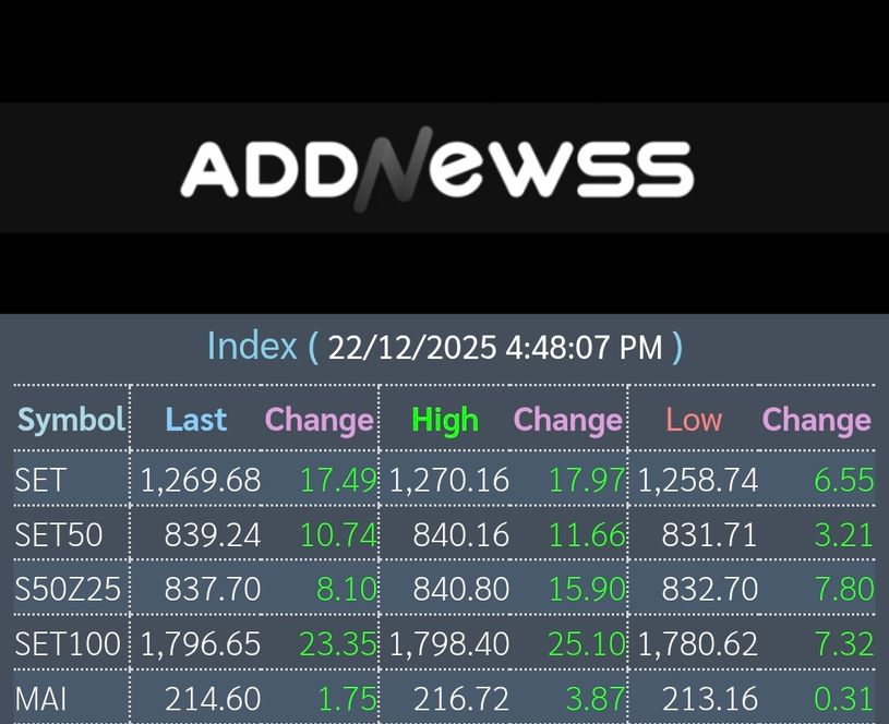 📊เย็นวันนี้ดัชนีตลาดหุ้นไทยปิดที่ 1,269.68 เพิ่มขึ้น +17.49 จุด หรือ +1.40%