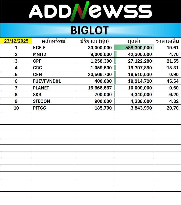 🔥BigLot 📅 23/12/2025 KCE-F มีมูลค่าสูงสุด 588.3 ล้าน ที่ราคาเฉลี่ย 19.61 บ.