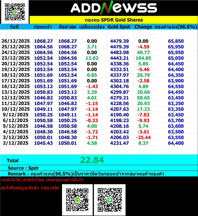ยอดสะสม Spdr ประจำวันที่ 26 ธันวาคม 2025 📅 2025-12-26 05:57 ✎ bom999 🗇 Gold 👍 - แชร์โพสต์นี้ ยอดสะสม Spdr ย้อนหลังประจำเดือนพฤศจิกายน 2025 https://addnewss.news/post/692a49e6475a669f8e0499a4
