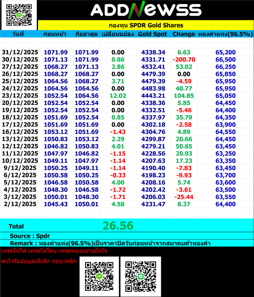 ยอดสะสม Spdr ประจำวันที่ 31 ธันวาคม 2025 📅 2025-12-31 12:08 ✎ bom999 🗇 Gold 👍 - แชร์โพสต์นี้ ยอดสะสม Spdr ย้อนหลังประจำเดือนพฤศจิกายน 2025 https://addnewss.news/post/692a49e6475a669f8e0499a4