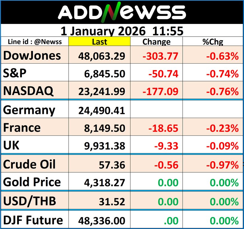 ทั้งนี้ ดัชนีเฉลี่ยอุตสาหกรรมดาวโจนส์ปิดที่ 48,063.29 จุด ลดลง 303.77 จุด หรือ -0.63%, ดัชนี S&P500 ปิดที่ 6,845.50 จุด ลดลง 50.74 จุด หรือ -0.74% และดัชนี Nasdaq ปิดที่ 23,241.99 จุด ลดลง 177.09 จุด หรือ -0.76%