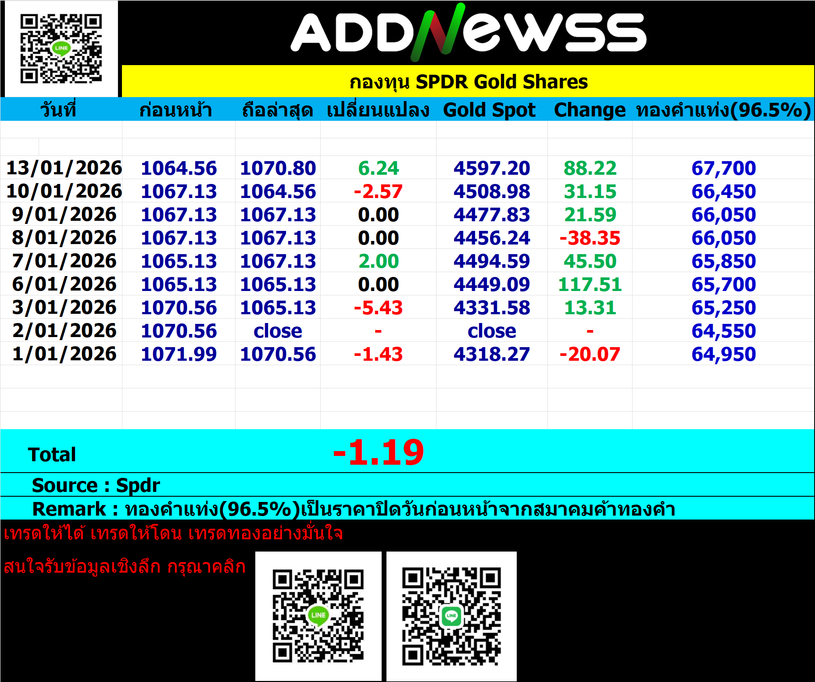 ยอดสะสม Spdr ประจำวันที่ 13 มกราคม 2026 📅 2026-01-13 07:12 ✎ bom999 🗇 Gold 👍 - แชร์โพสต์นี้ ยอดสะสม Spdr ย้อนหลังประจำเดือนธันวาคม 2025 https://addnewss.news/post/6954b01717544ae1ef0a8542