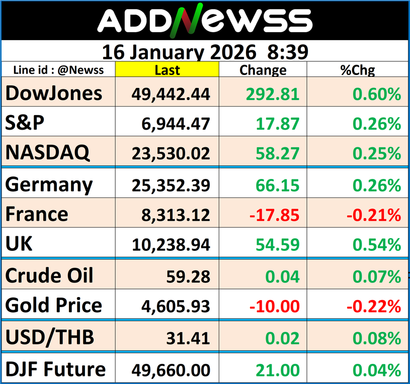 ทั้งนี้ ดัชนีเฉลี่ยอุตสาหกรรมดาวโจนส์ปิดที่ 49,442.44 จุด เพิ่มขึ้น 292.81 จุด หรือ +0.60%, ดัชนี S&P500 ปิดที่ 6,944.47 จุด เพิ่มขึ้น 17.87 จุด หรือ +0.26% และดัชนี Nasdaq ปิดที่ 23,530.02 จุด เพิ่มขึ้น 58.27 จุด หรือ +0.25%
