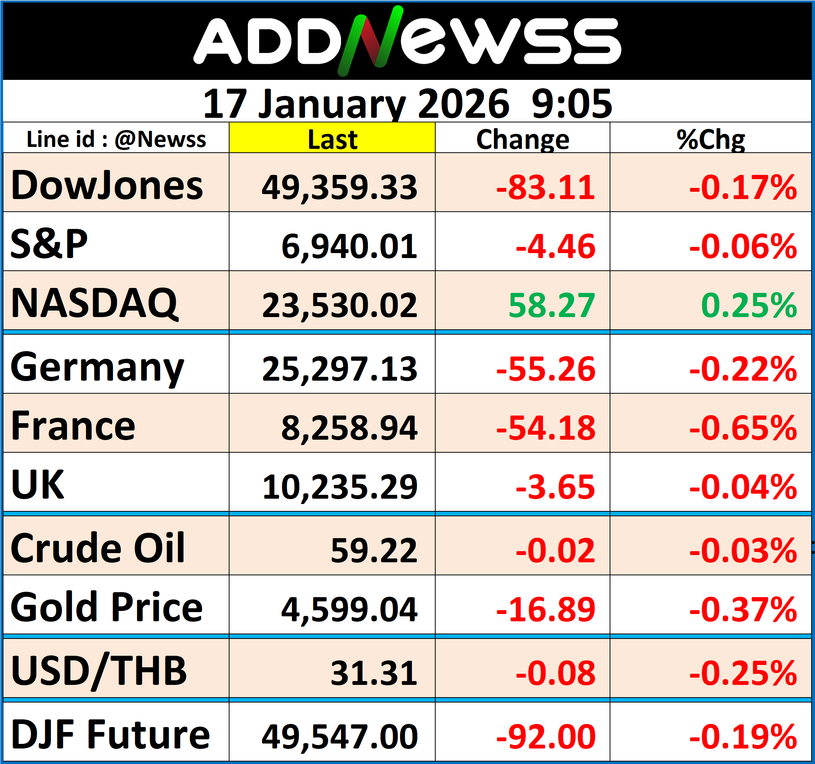 ทั้งนี้ ดัชนีเฉลี่ยอุตสาหกรรมดาวโจนส์ปิดที่ 49,359.33 จุด ลดลง 83.11 จุด หรือ -0.17%, ดัชนี S&P500 ปิดที่ 6,940.01 จุด ลดลง 4.46 จุด หรือ -0.06% และดัชนี Nasdaq ปิดที่ 23,515.39 จุด ลดลง 14.63 จุด หรือ -0.06%