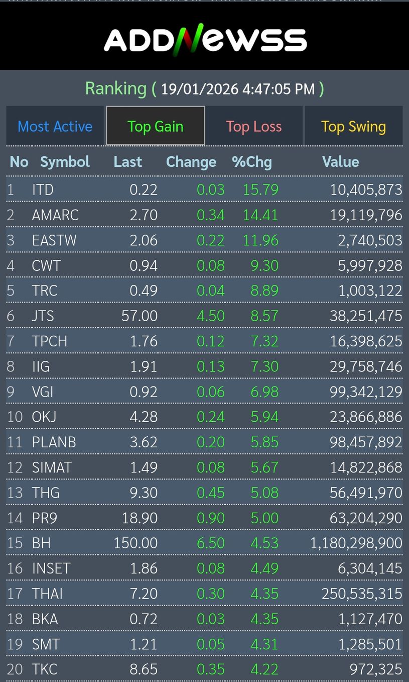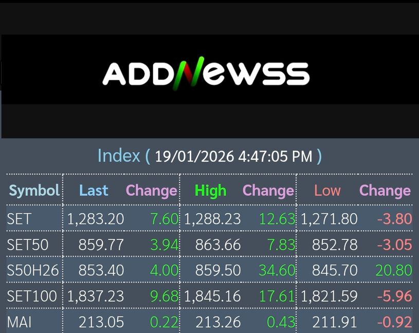 📊เย็นวันนี้ดัชนีตลาดหุ้นไทยปิดที่ 1,283.20 เพิ่มขึ้น +7.60 จุด หรือ +0.60%