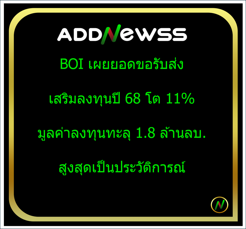 IQ > -BOI เผยยอดขอรับส่งเสริมลงทุนปี 68 โต 11% มูลค่าลงทุนทะลุ 1.8 ล้านลบ. สูงสุดเป็นประวัติการณ์