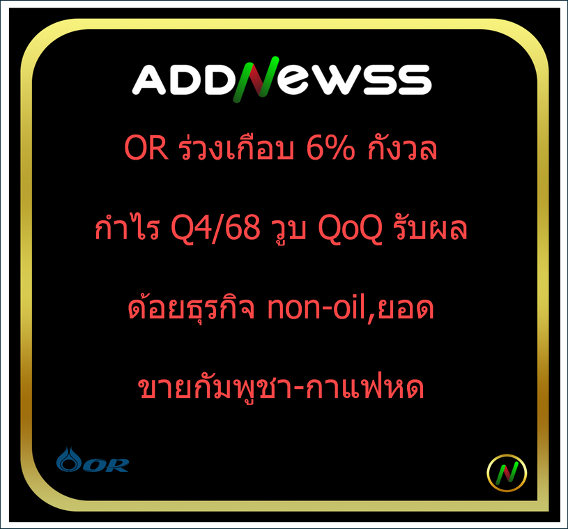 ด้าน บล.อินโนเวสท์ เอกซ์ ระบุว่า OR ร่วงเกือบ 6% คาดเป็นผลมาจากกำไร QoQ ในไตรมาส 4/68 ที่ลดลง INVX มอง หุ้นลงน่าจะเป็นเพียงระยะสั้น ขณะที่กระแสเงินสดจากการดำเนินงานยังแกร่ง