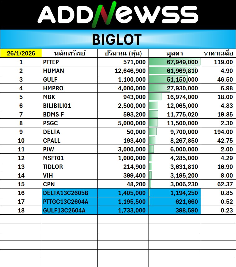 🔥BigLot 📅 26/01/2026 PTTEP มีมูลค่าสูงสุด 67.9 ล้าน ที่ราคาเฉลี่ย 119 บ.