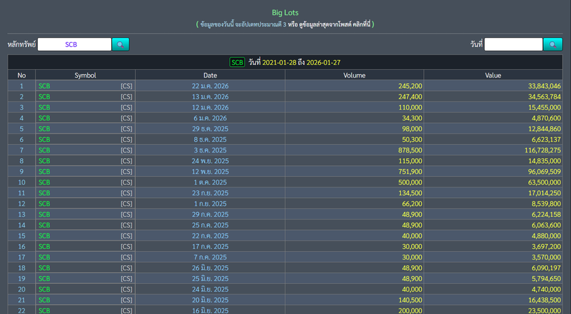 ลูกค้าสามารถตรวจสอบรายการซื้อขาย Big Lot หุ้น SCB ย้อนหลังได้อย่างสะดวก