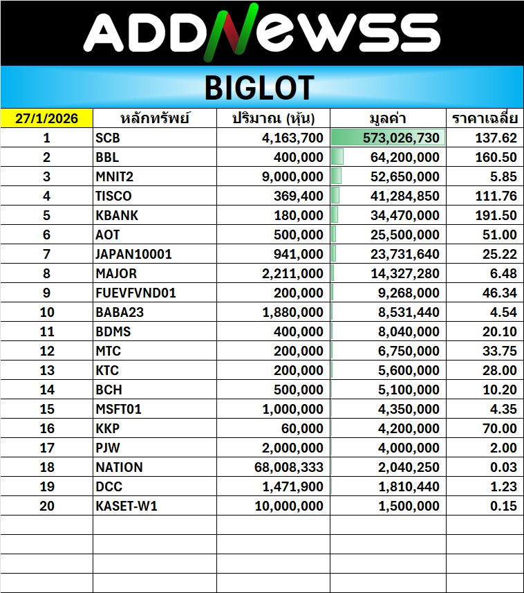 🔥BigLot 📅 27/01/2026 SCB มีมูลค่าสูงสุด 573 ล้าน ที่ราคาเฉลี่ย 137.62 บ.