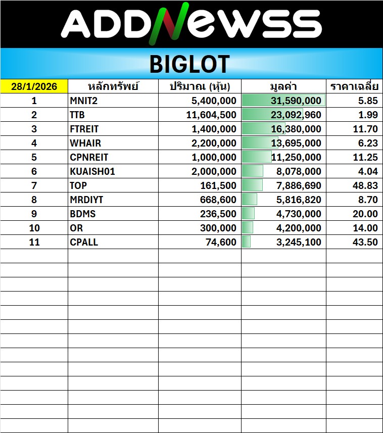 🔥BigLot 📅 28/01/2026 MNIT2 มีมูลค่าสูงสุด 31.6 ล้าน ที่ราคาเฉลี่ย 5.85 บ.