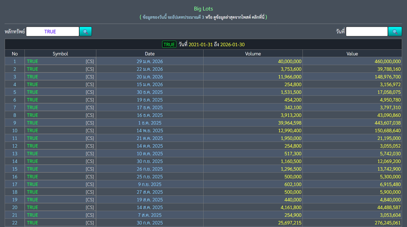 ลูกค้าสามารถตรวจสอบรายการซื้อขาย Big Lot หุ้น TRUE ย้อนหลังได้อย่างสะดวก