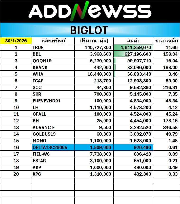 🔥BigLot 📅 30/01/2026 TRUE มีมูลค่าสูงสุด 1641.4 ล้าน ที่ราคาเฉลี่ย 11.66 บ.
