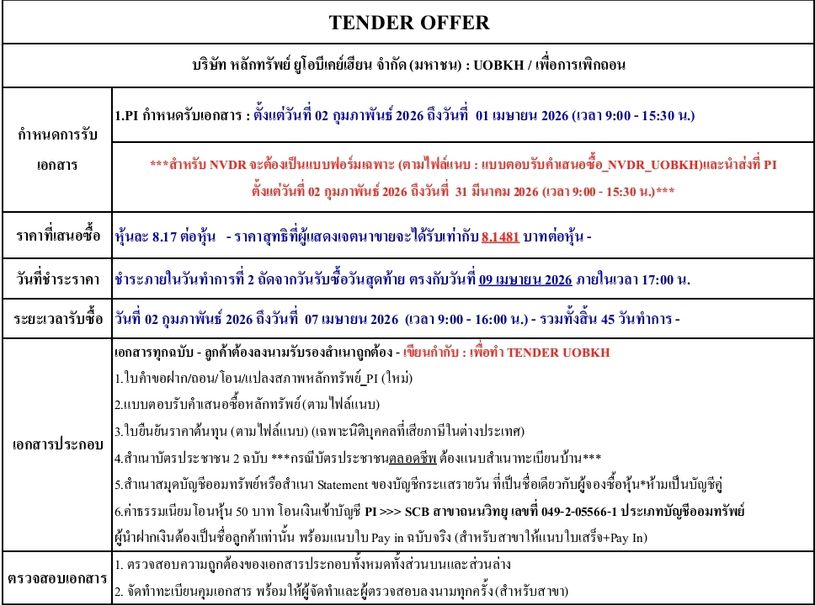 ð āļĢāļēāļĒāļĨāļ°āđāļāļĩāļĒāļāļāļēāļĢāļāļģ TENDER OFFER āļŦāļļāđāļ UOBKH, UOBKH-R (āđāļāļ·āđāļāļāļēāļĢāđāļāļīāļāļāļāļ) ***PI āļĢāļąāļāđāļāļāļŠāļēāļĢāļāļķāļāļ§āļąāļāļāļĩāđ 01 āđāļĄāļĐāļēāļĒāļ 2026***
