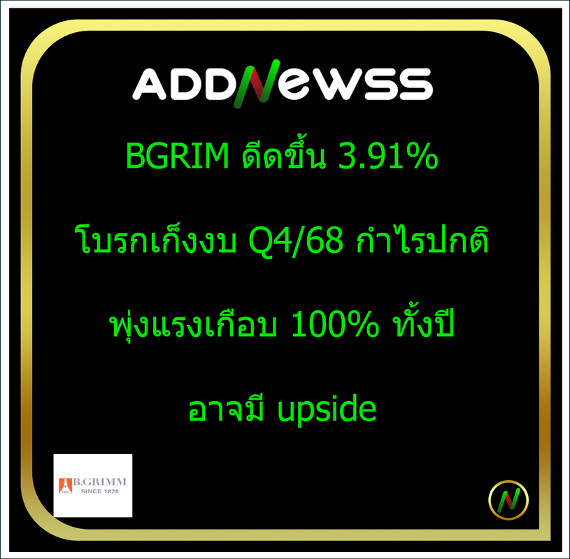 IQ > -BGRIM ดีดขึ้น 3.91% โบรกเก็งงบ Q4/68 กำไรปกติพุ่งแรงเกือบ 100% ทั้งปีอาจมี upside