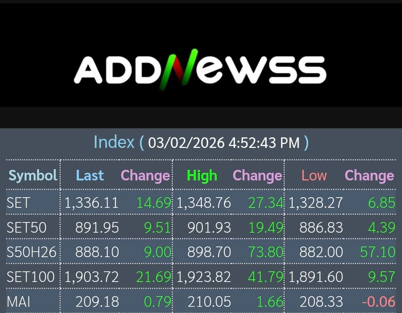 📊เย็นวันนี้ดัชนีตลาดหุ้นไทยปิดที่ 1,336.11 เพิ่มขึ้น +14.69จุด หรือ +1.11%