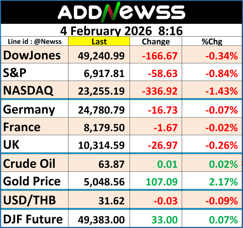 ทั้งนี้ ดัชนีเฉลี่ยอุตสาหกรรมดาวโจนส์ปิดที่ 49,240.99 จุด ลดลง 166.67 จุด หรือ -0.34%, ดัชนี S&P500 ปิดที่ 6,917.81 จุด ลดลง 58.63 จุด หรือ -0.84% และดัชนี Nasdaq ปิดที่ 23,255.19 จุด ลดลง 336.92 จุด หรือ -1.43%