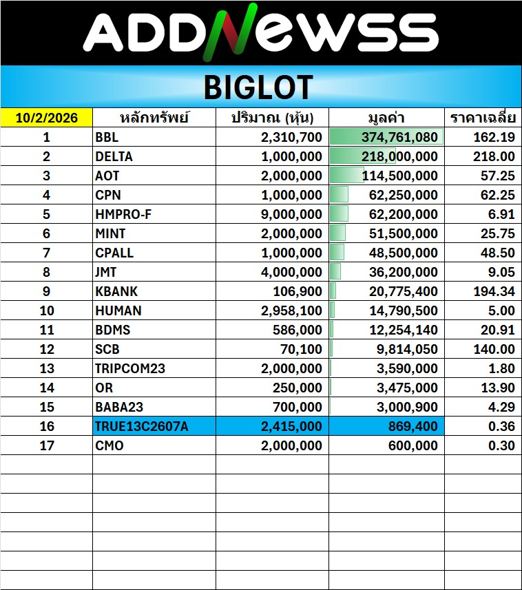 🔥BigLot 📅 10/02/2026 BBL มีมูลค่าสูงสุด 374.8 ล้าน ที่ราคาเฉลี่ย 162.19 บ.
