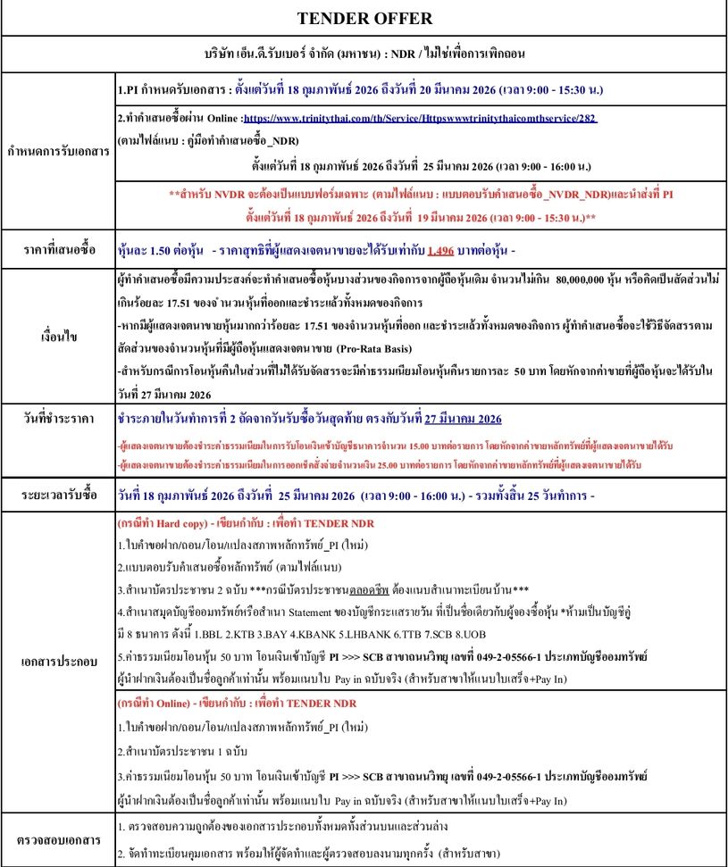 āļĢāļēāļĒāļĨāļ°āđāļāļĩāļĒāļāļāļēāļĢāļāļģ TENDER OFFER āļŦāļļāđāļ NDR, NDR-R (āđāļĄāđāđāļāđāđāļāļ·āđāļāļāļēāļĢāđāļāļīāļāļāļāļ)