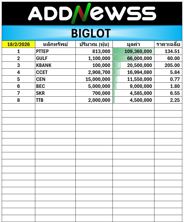 🔥BigLot 📅 18/02/2026 PTTEP มีมูลค่าสูงสุด 109.4 ล้าน ที่ราคาเฉลี่ย 134.51 บ.