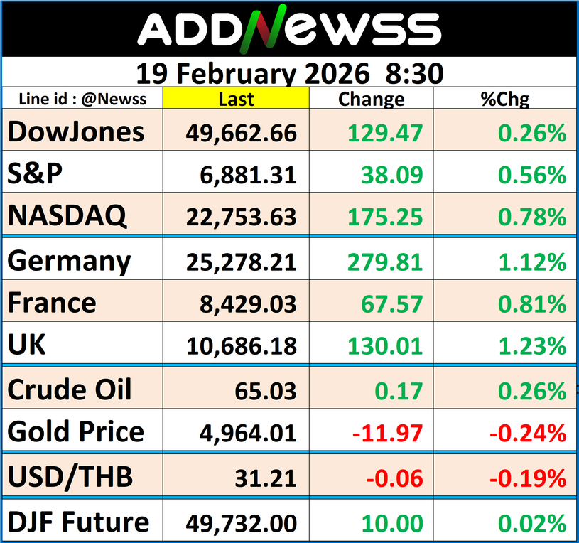 ทั้งนี้ ดัชนีเฉลี่ยอุตสาหกรรมดาวโจนส์ปิดที่ 49,662.66 จุด เพิ่มขึ้น 129.47 จุด หรือ +0.26%, ดัชนี S&P500 ปิดที่ 6,881.31 จุด เพิ่มขึ้น 38.09 จุด หรือ +0.56% และดัชนี Nasdaq ปิดที่ 22,753.63 จุด เพิ่มขึ้น 175.25 จุด หรือ +0.78%