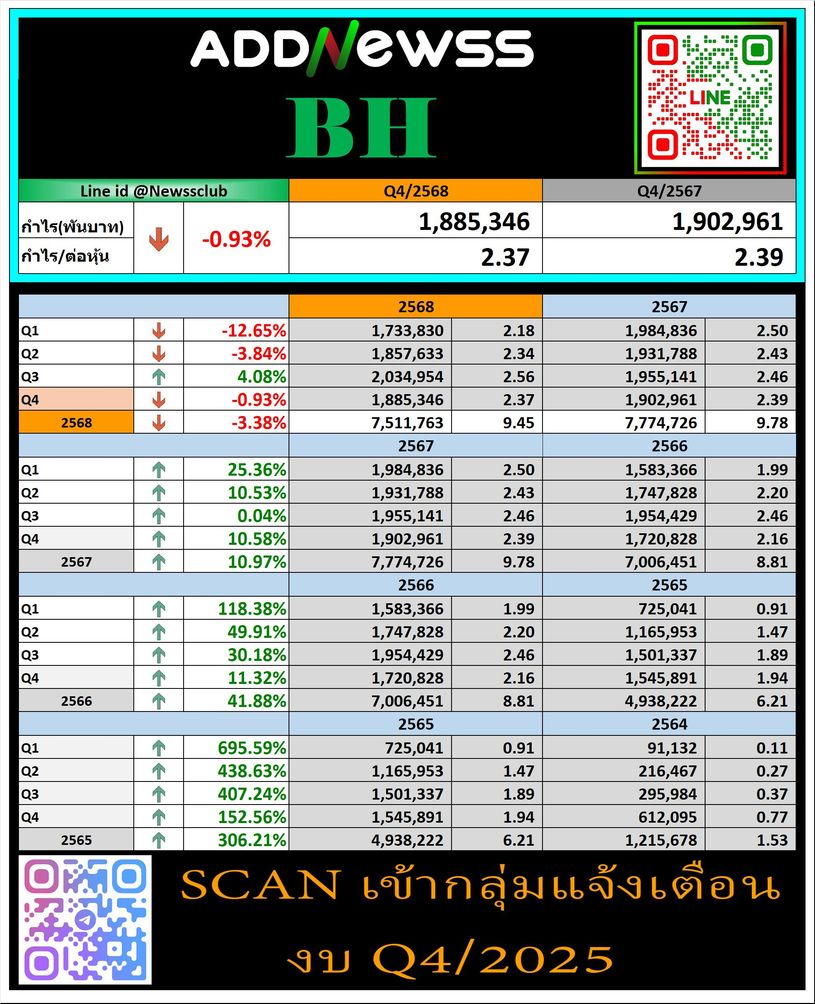 บริษัท โรงพยาบาลบำรุงราษฎร์ จำกัด (มหาชน) หรือ BH รายงานผลการดำเนินงานปี 2568 มีกำไรสุทธิส่วนที่เป็นของผู้ถือหุ้นใหญ่ 7,512 ล้านบาท ลดลงจากปี 2567 ที่มีกำไร 7,775 ล้านบาท คิดเป็นการปรับลดลงประมาณ 3.4%YoY
