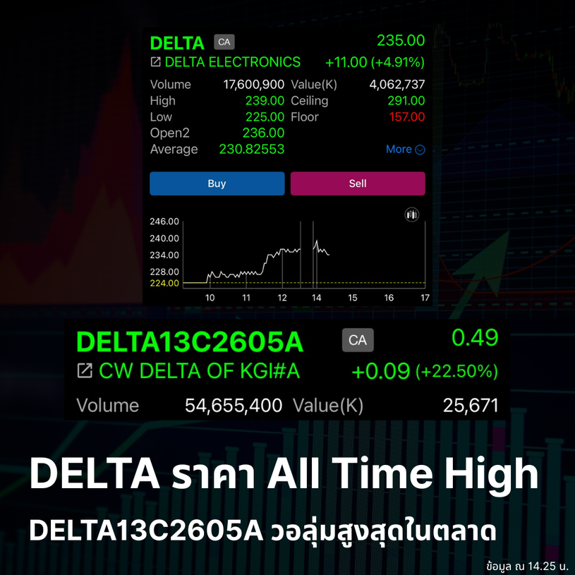 DELTA ราคา All Time High วันนี้ทำราคาสูงสุดที่ 239 บาท DELTA13C2605A วอลุ่มสูงสุดในตลาด