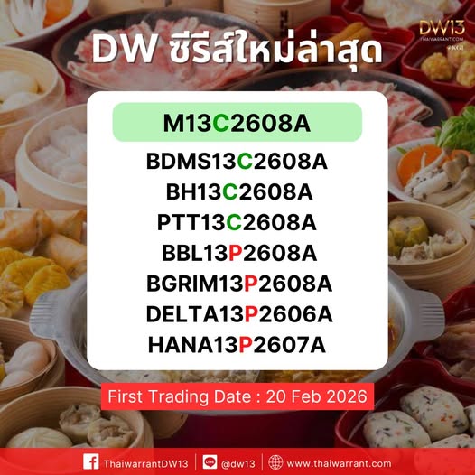 DW13 พร้อมเสิร์ฟ !! Call: M, BDMS, BH, PTT Put: BBL, BGRIM, DELTA, HANA