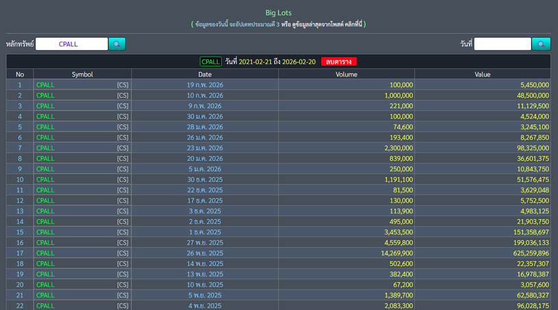 ลูกค้าสามารถตรวจสอบรายการซื้อขาย Big Lot หุ้น CPALL ย้อนหลังได้อย่างสะดวก