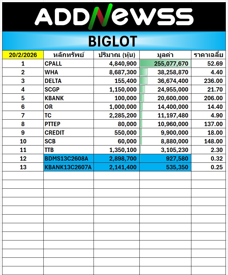 🔥BigLot 📅 20/02/2026 CPALL มีมูลค่าสูงสุด 255.1 ล้าน ที่ราคาเฉลี่ย 52.69 บ.
