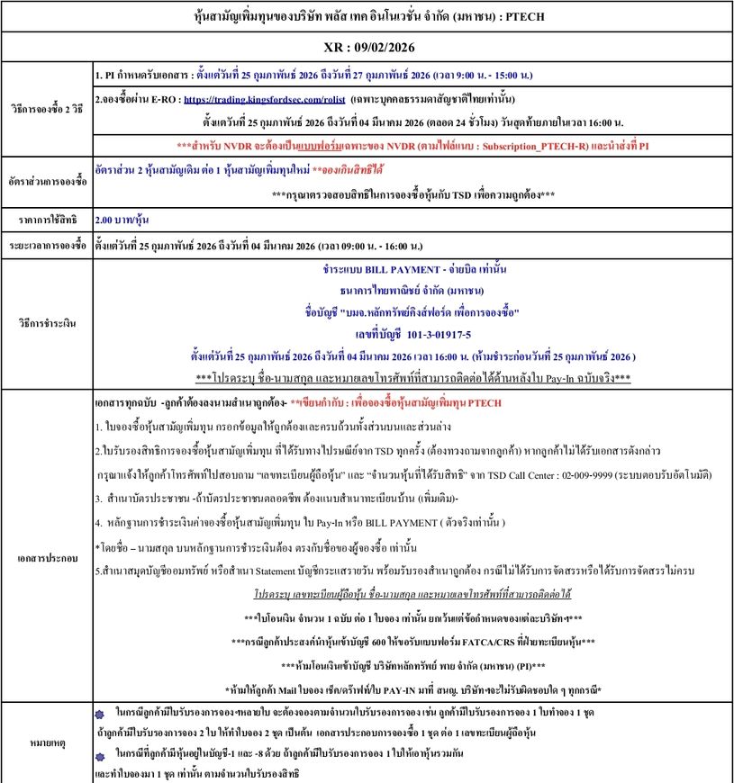 2.🖥️จองออนไลน์ : โดยจองซื้อผ่าน E-RO (คู่มือจองซื้อE-RO_PTECH ตามไฟล์แนบด้านล่าง) ได้ที่ลิ้งค์https://trading.kingsfordsec.com/rolist ***เฉพาะบุคคลธรรมดาสัญชาติไทยเท่านั้น***