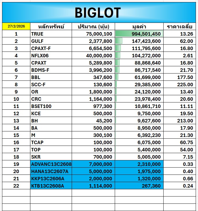 🔥BigLot 📅 27/02/2026 TRUE มีมูลค่าสูงสุด 994.5 ล้าน ที่ราคาเฉลี่ย 13.26 บ.