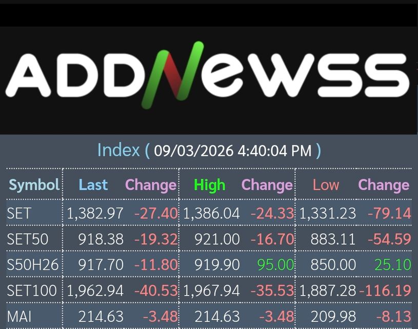 📊เย็นวันนี้ดัชนีตลาดหุ้นไทยปิดที่ 1,382.97 ลดลง -27.40 จุด หรือ -1.94%