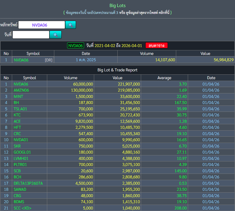 🔥BigLot 📅 01/04/2026 NVDA06 มีมูลค่าสูงสุด 221.9 ล้าน ที่ราคาเฉลี่ย 3.7 บ.
