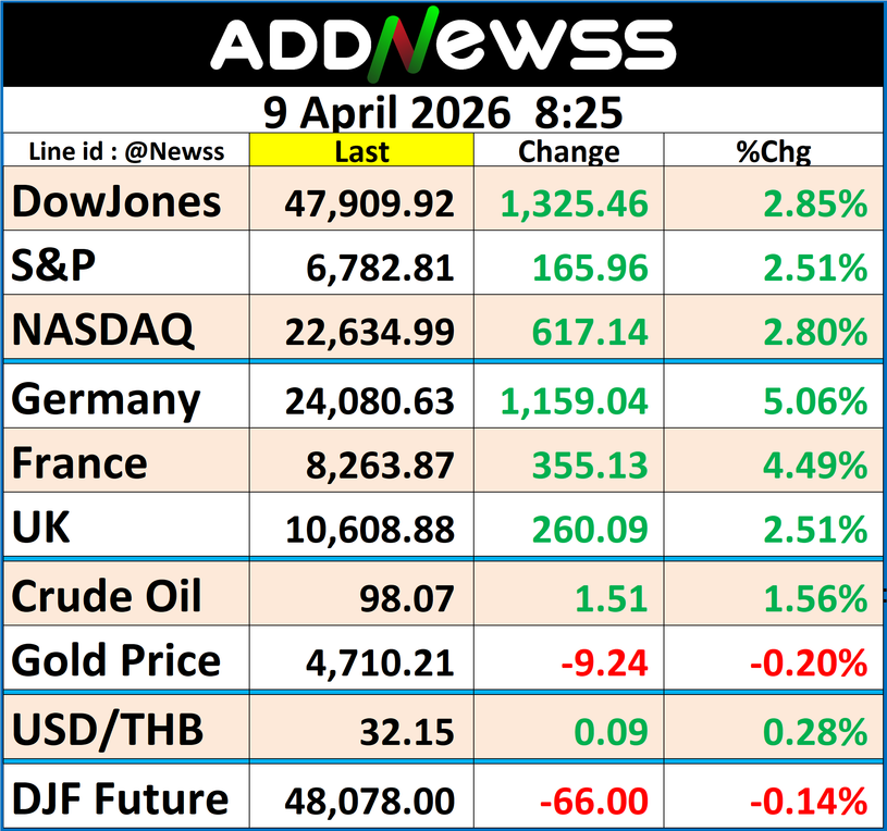 ทั้งนี้ ดัชนีเฉลี่ยอุตสาหกรรมดาวโจนส์ปิดที่ 47,909.92 จุด เพิ่มขึ้น 1,325.46 จุด หรือ +2.85%, ดัชนี S&P500 ปิดที่ 6,782.81 จุด เพิ่มขึ้น 165.96 จุด หรือ +2.51% และดัชนี Nasdaq ปิดที่ 22,634.99 จุด เพิ่มขึ้น 617.14 จุด, +2.80%