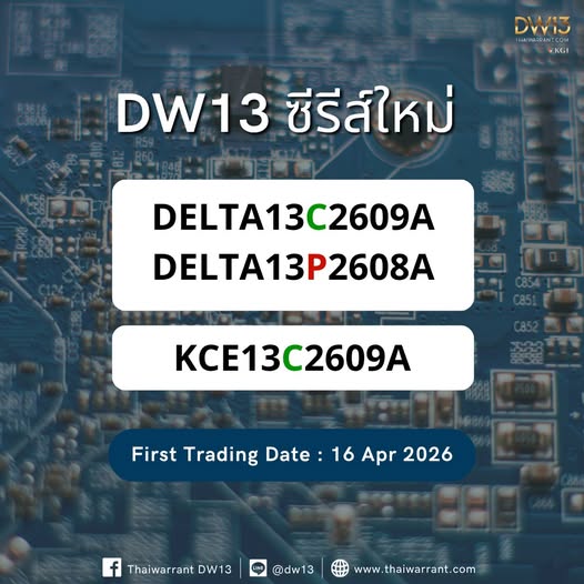 พบกับ DW13 อ้างอิงหุ้น DELTA ทั้ง Call และ Put !! มาพร้อมกับ KCE Call https://www.thaiwarrant.com/kgi-dw/newdw