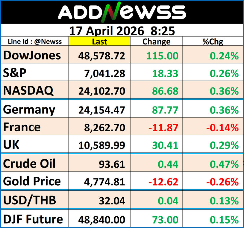 ทั้งนี้ ดัชนีเฉลี่ยอุตสาหกรรมดาวโจนส์ปิดที่ 48,578.72 จุด เพิ่มขึ้น 115.00 จุด หรือ +0.24%, ดัชนี S&P500 ปิดที่ 7,041.28 จุด เพิ่มขึ้น 18.33 จุด หรือ +0.26% และดัชนี Nasdaq ปิดที่ 24,102.70 จุด เพิ่มขึ้น 86.69 จุด หรือ +0.36%