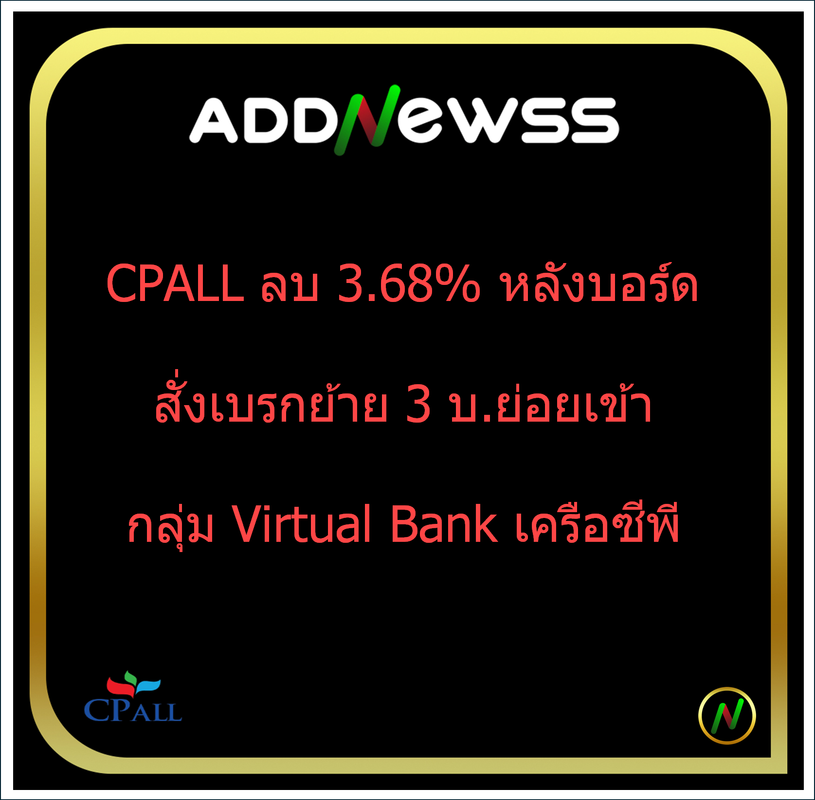 IQ > HILITE: CPALL ลบ 3.68% หลังบอร์ดสั่งเบรกย้าย 3 บ.ย่อยเข้ากลุ่ม Virtual Bank เครือซีพี,โบรกมองเสี่ยงกระทบกำไร