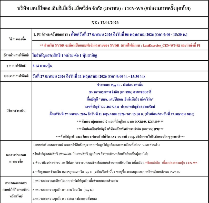 💠รายละเอียดการใช้สิทธิแปลงสภาพหุ้น : CEN-W5, CEN-W5-R (ครั้งสุดท้าย) ***PI รับเอกสารตั้งแต่วันที่ 27 เมษายน - 06 พฤษภาคม 2026***