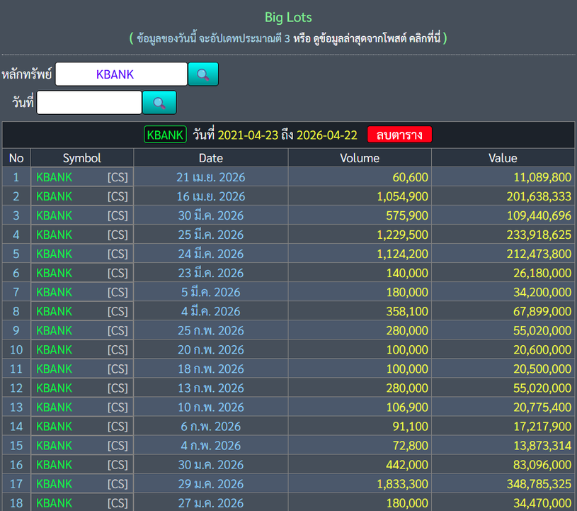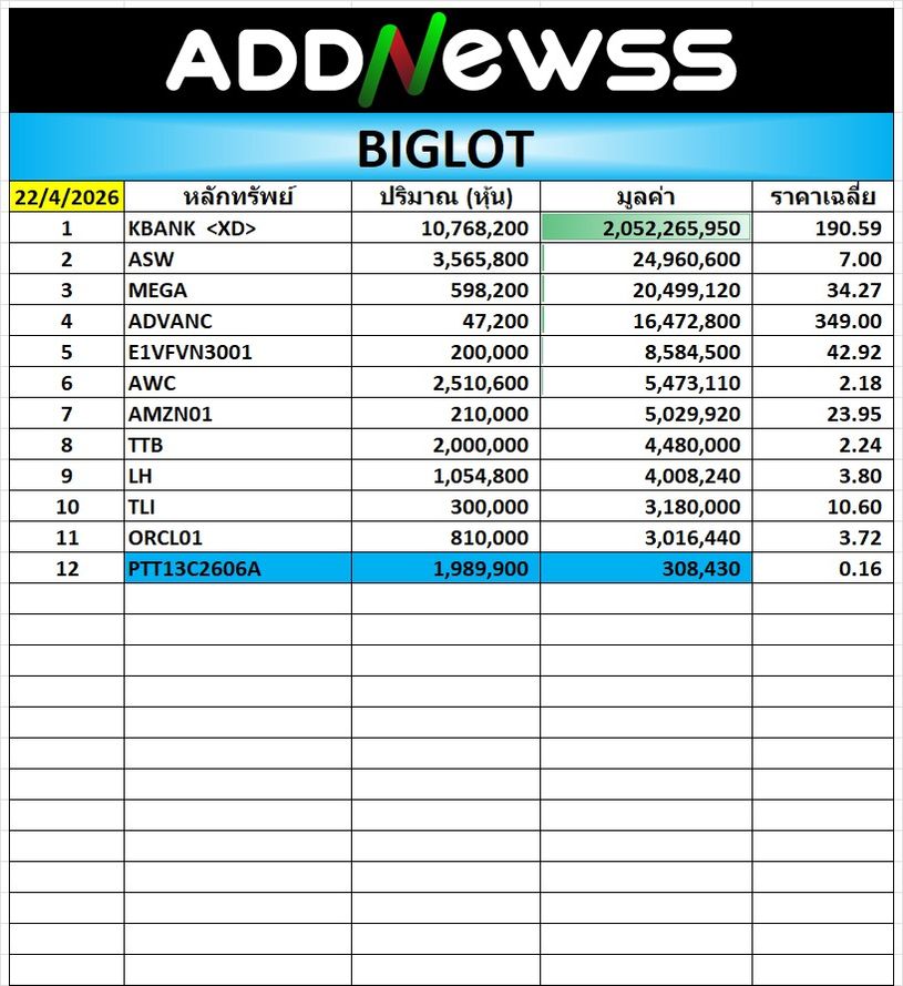 🔥BigLot 📅 22/04/2026 KBANK มีมูลค่าสูงสุด 2052.3 ล้าน ที่ราคาเฉลี่ย 190.59 บ.